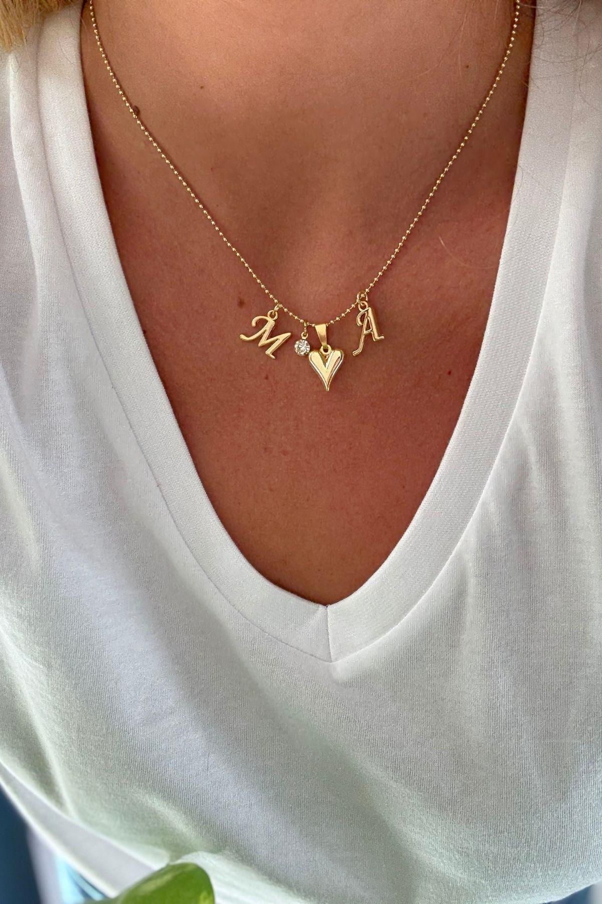 İki Harfli Kalp ve Zirkon Taşlı Kolye (Harf Belirtiniz) (TB25-0196)