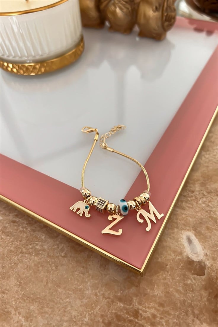 Kişiye Özel Harfleri Seçilebilir Beyaz Mineli Fil Figürlü Bileklik (TB22-TBB-0586)