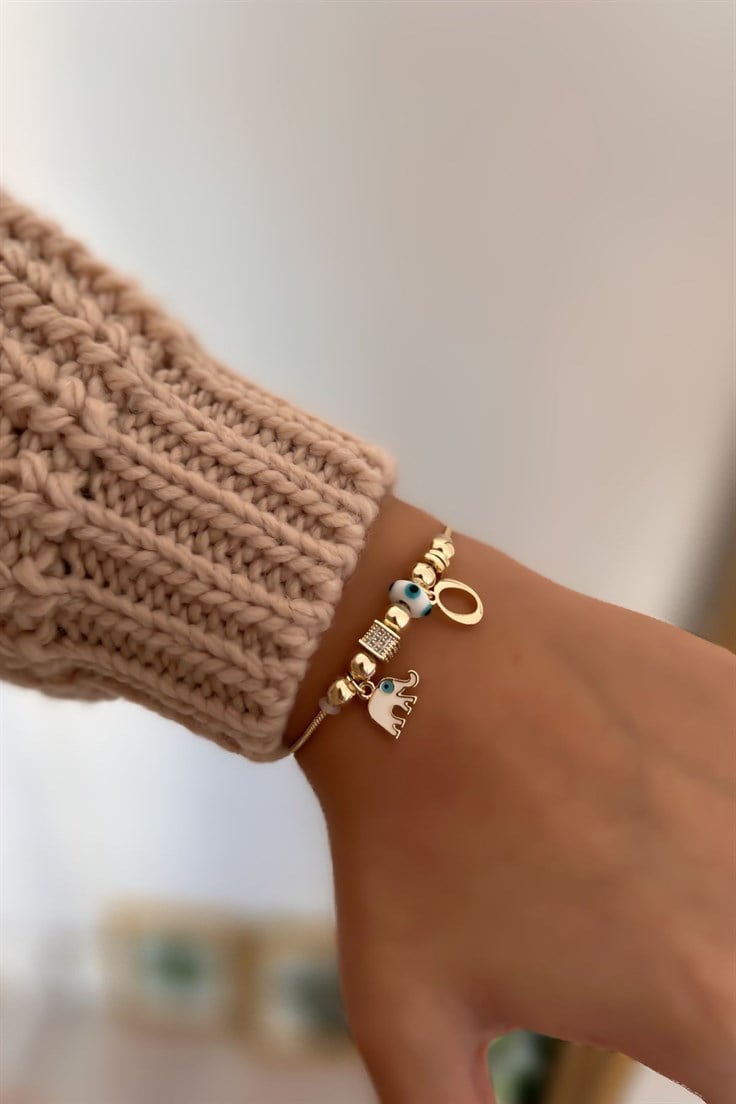 O Harfli ve Beyaz Mineli Fil Figürlü Nazar Bileklik (TB22-TBB-0068)